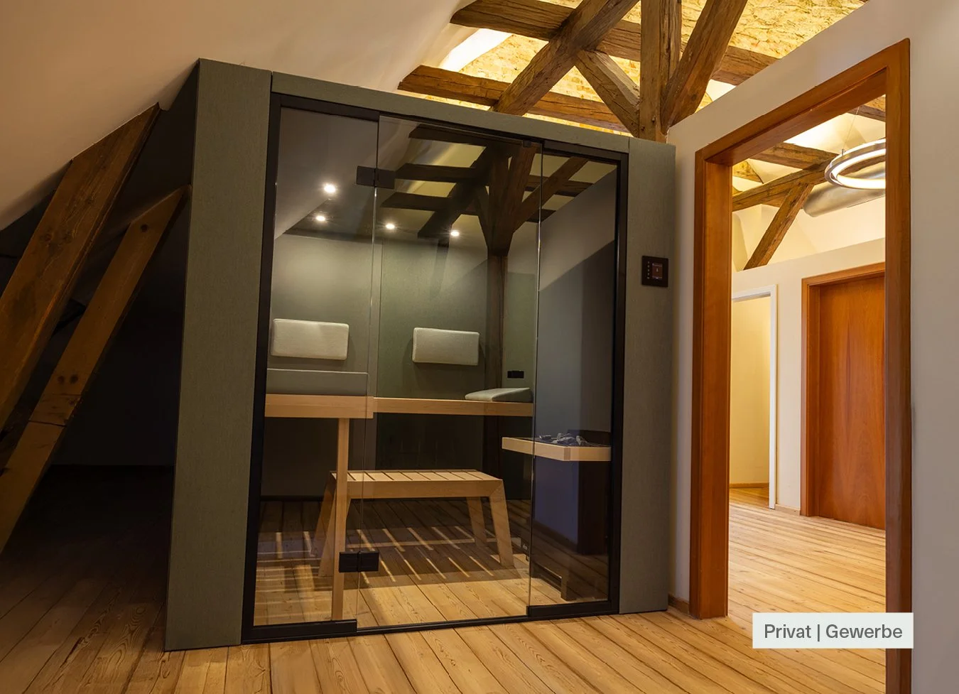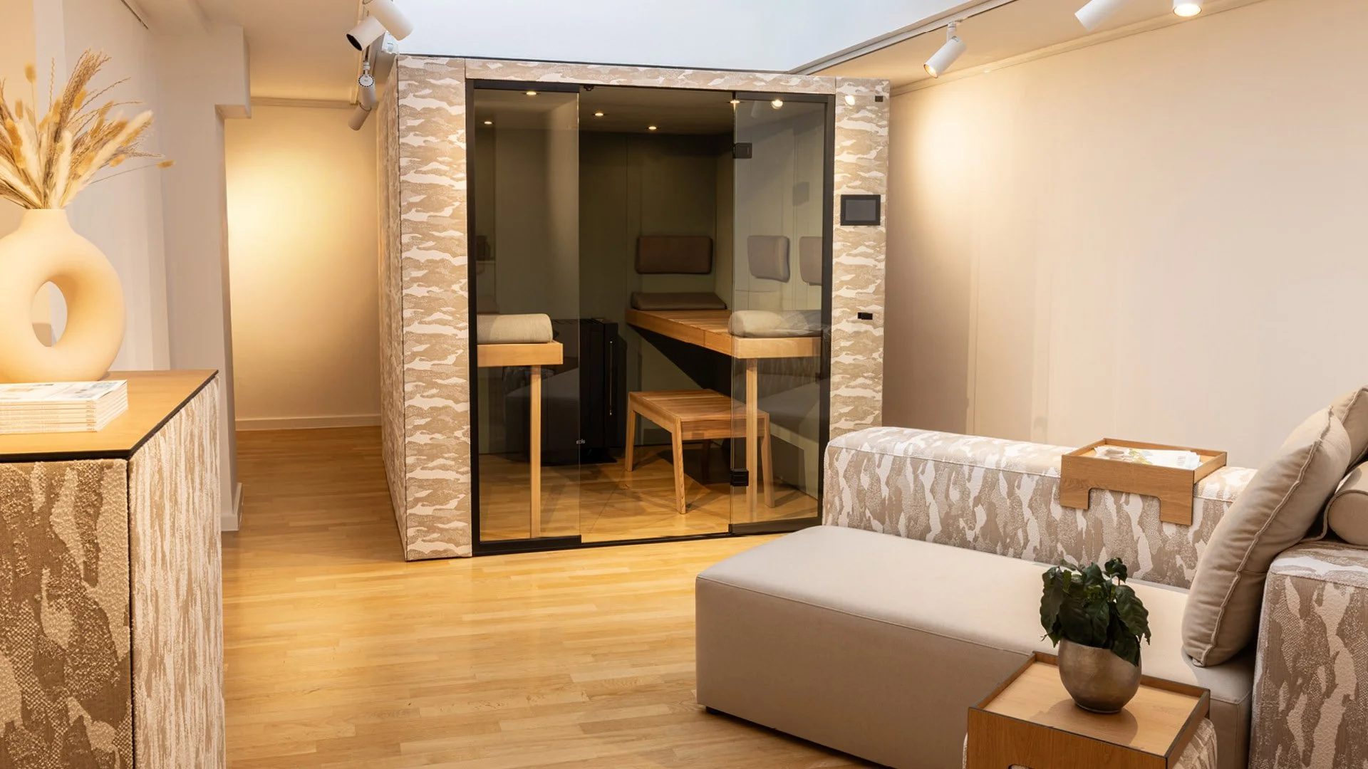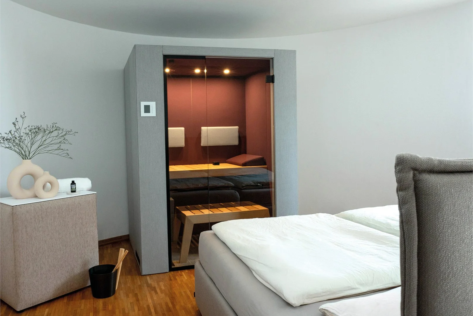 Die Sauna als Möbelstück, entwickelt für den professionellen Einsatz im Gewerbe ebenso wie für anspruchsvolle private Lebens- und Wellnessräume.